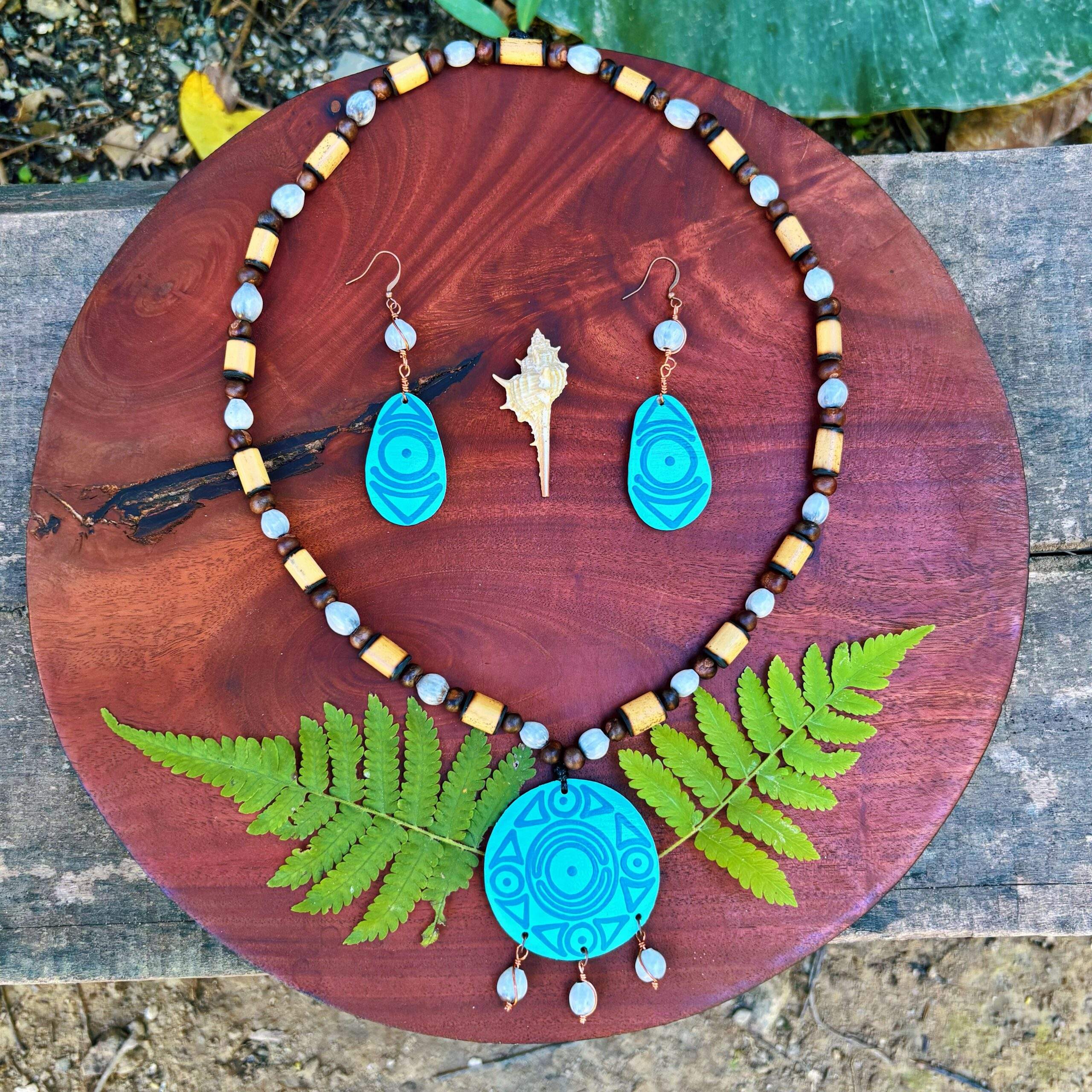 Collar y pantallas hecho con higüera y semillas nativas pintado a mano con diseños inspirados en arte ancestral de nuestro archipiélago.
