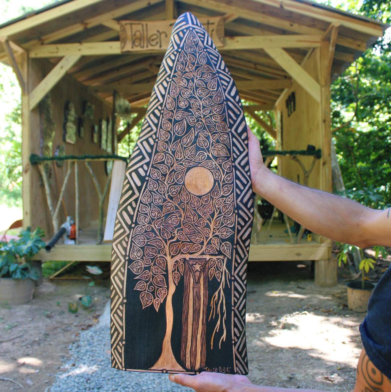 Pieza artesanal decorativa para interior en madera del país con un acabado con brillo sin alterar el color natural de la madera.