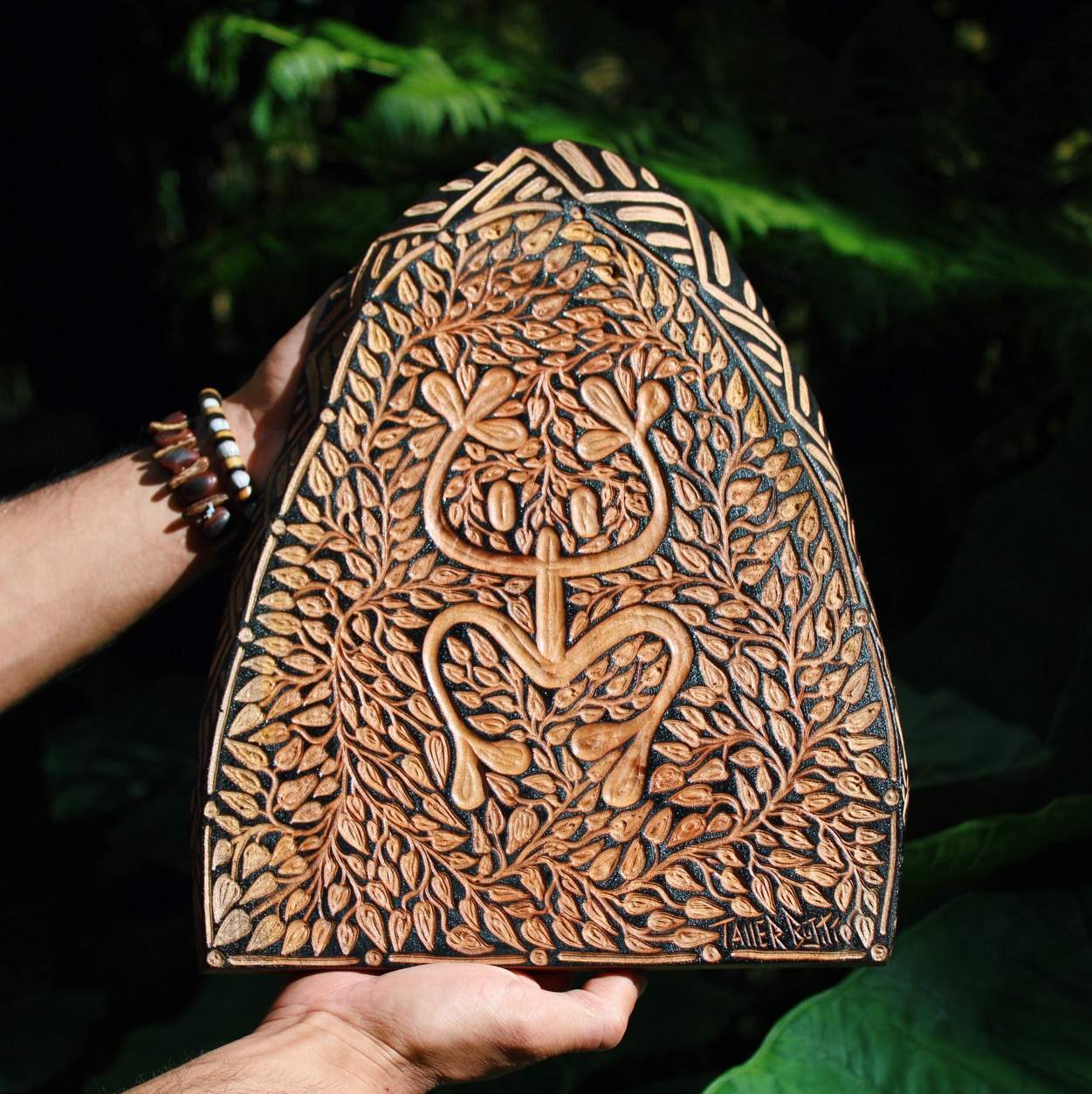 Pieza artesanal decorativa para interior en madera del país con un acabado con brillo sin alterar el color natural de la madera.