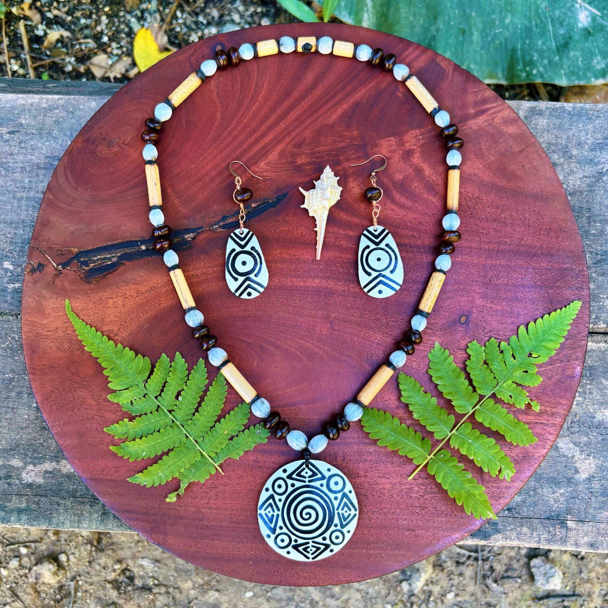 Collar y pantallas hecho con higüera y semillas nativas pintado a mano con diseños inspirados en arte ancestral de nuestro archipiélago.