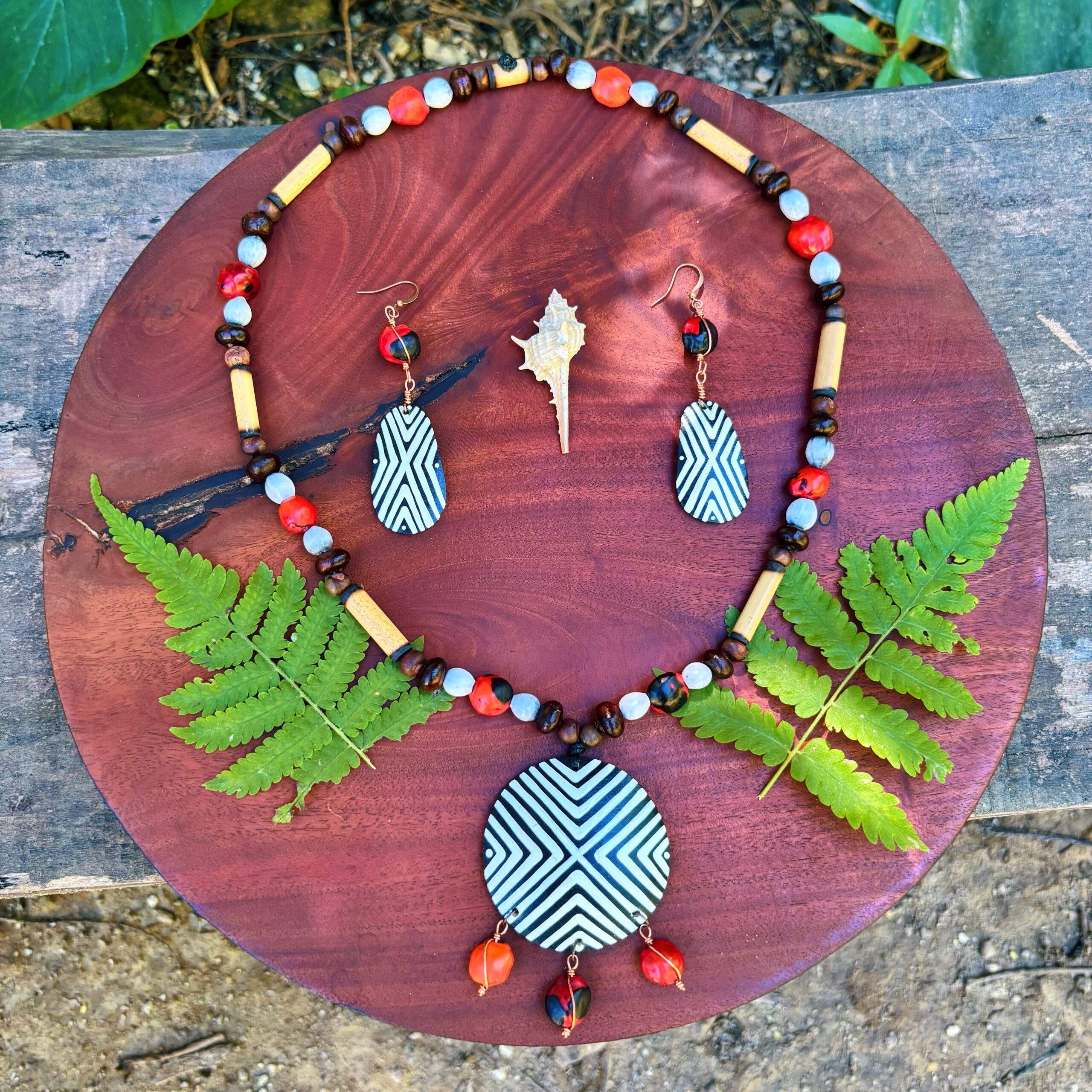 Collar y pantallas hecho con higüera y semillas nativas pintado a mano con diseños inspirados en arte ancestral de nuestro archipiélago.